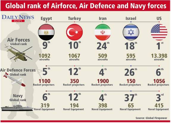 ទិដ្ឋភាពទី៤- កម្លាំងយោធា, សម្រាប់ឆ្នាំ ២០២១ យោធាអ៊ីស្រាអែលស្ថិតក្នុងចំណាត់ថ្នាក់ទី២០ ក្នុងចំណោម១៤០ប្រទេស ខណៈពេលដែលចំណាត់ថ្នាក់ប្រទេសក្បែរខាងអ៊ីស្រាអែល រួមមានស៊ីរីឈរនៅចំណាត់ថ្នាក់លេខ៦៥, ហ្សកដានីលេខ៧៤,លីបង់១១៦ និងអេហ្ស៊ីបលេខ ១៣[8]។