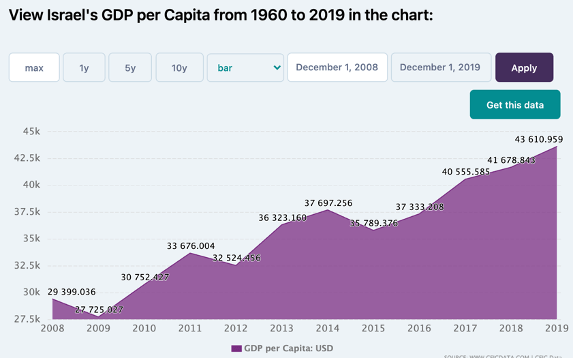 ទិដ្ឋភាពទី៦- សេដ្ឋកិច្ចនិងលំហូរសាច់ប្រាក់, បើយើងក្រឡេកមើលពីផលទុនសរុបសម្រាប់មនុស្សម្នាក់ប្រចាំឆ្នាំ(GDP per Capita) របស់អ៊ីស្រាអែលវិញ យើងឃើញមានចំនួន ៤៣,៥៨៨.៧១៣ ក្នុងឆ្នាំ២០១៩[11] ដែលជាតួលេខមួយខ្ពស់សម្បើមណាស់។