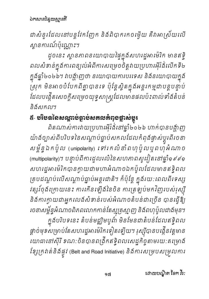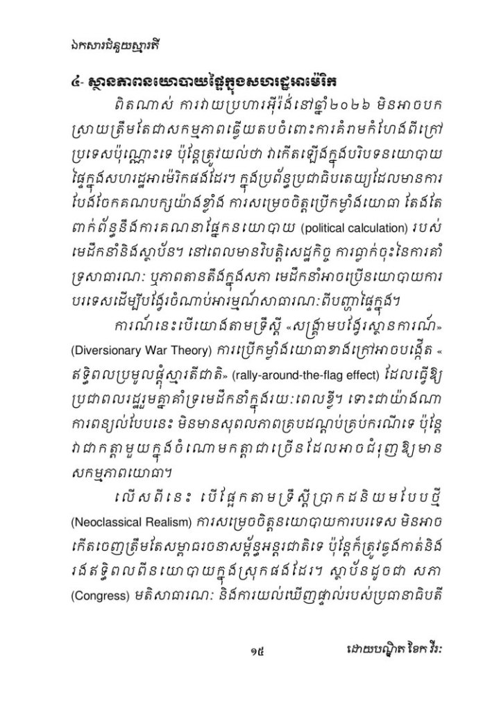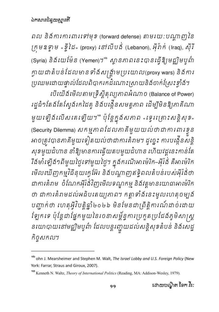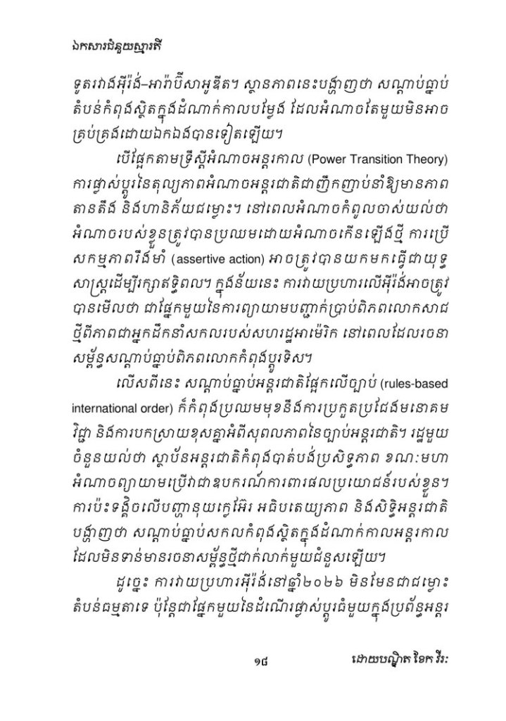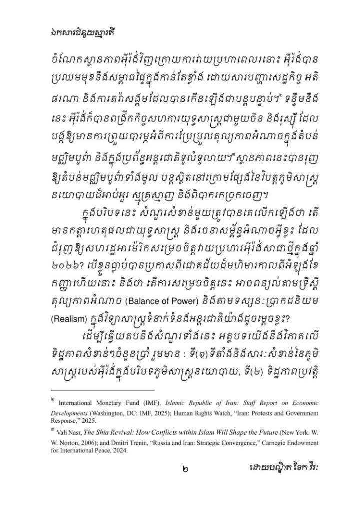Uncategorized ហេតុអ្វីបានជាអាម៉េរិកវាយប្រហារអ៊ីរ៉ង់សាជាថ្មីក្នុងឆ្នាំ២០២៦? ពីជ្រុងភូមិសាស្ត្រនយោបាយ ការវិភាគយុទ្ធសាស្ត្រ និងតុល្យភាពអំណាចក្នុងតំបន់មជ្ឈិមបូព៌ា Date: March 1, 2026Author: khekvireak 0 Comments Share this: Share on X (Opens in new window) X Share on Facebook (Opens in new window) Facebook Like Loading...